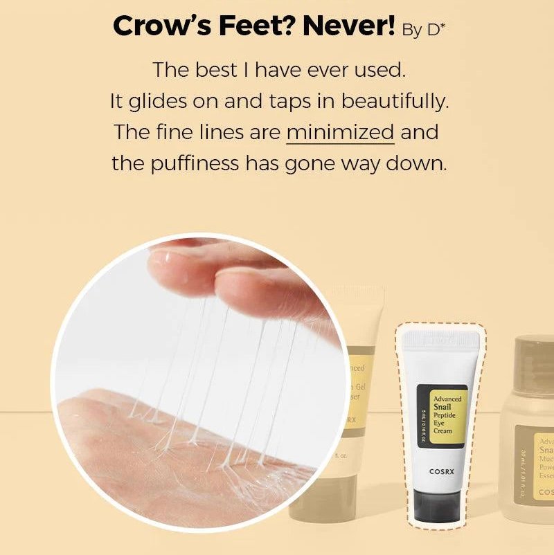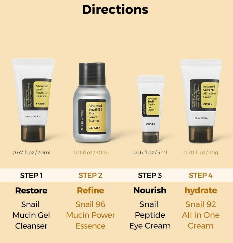 Cosrx's Most Loved 4-step Advanced Snail Trial Kit: Skincare essentials formulated with snail mucin for repairing, moisturizing, and soothing skin.